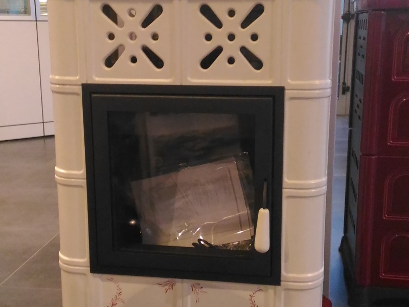 Pregiata stufa in maiolica bordeaux e bianca.
